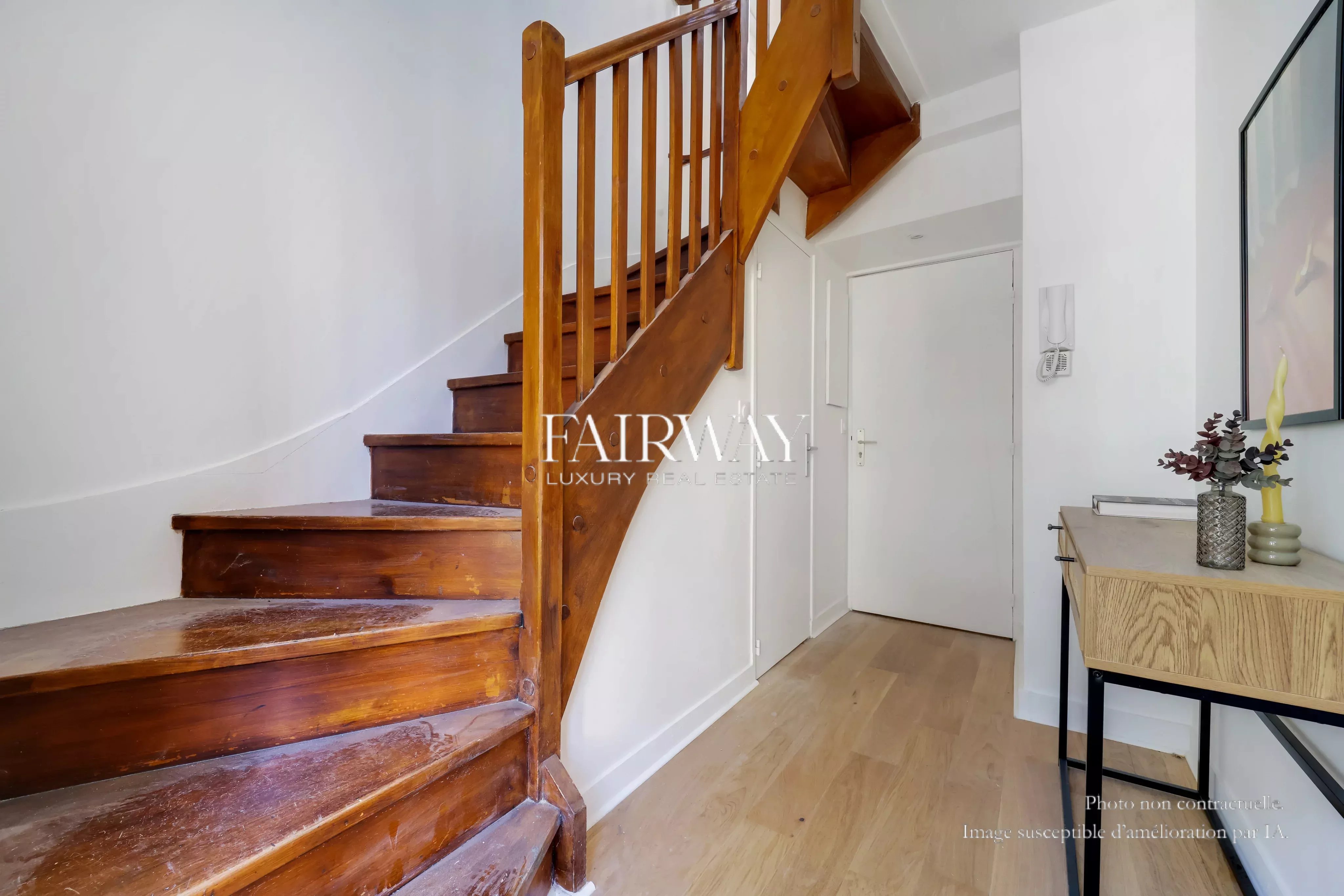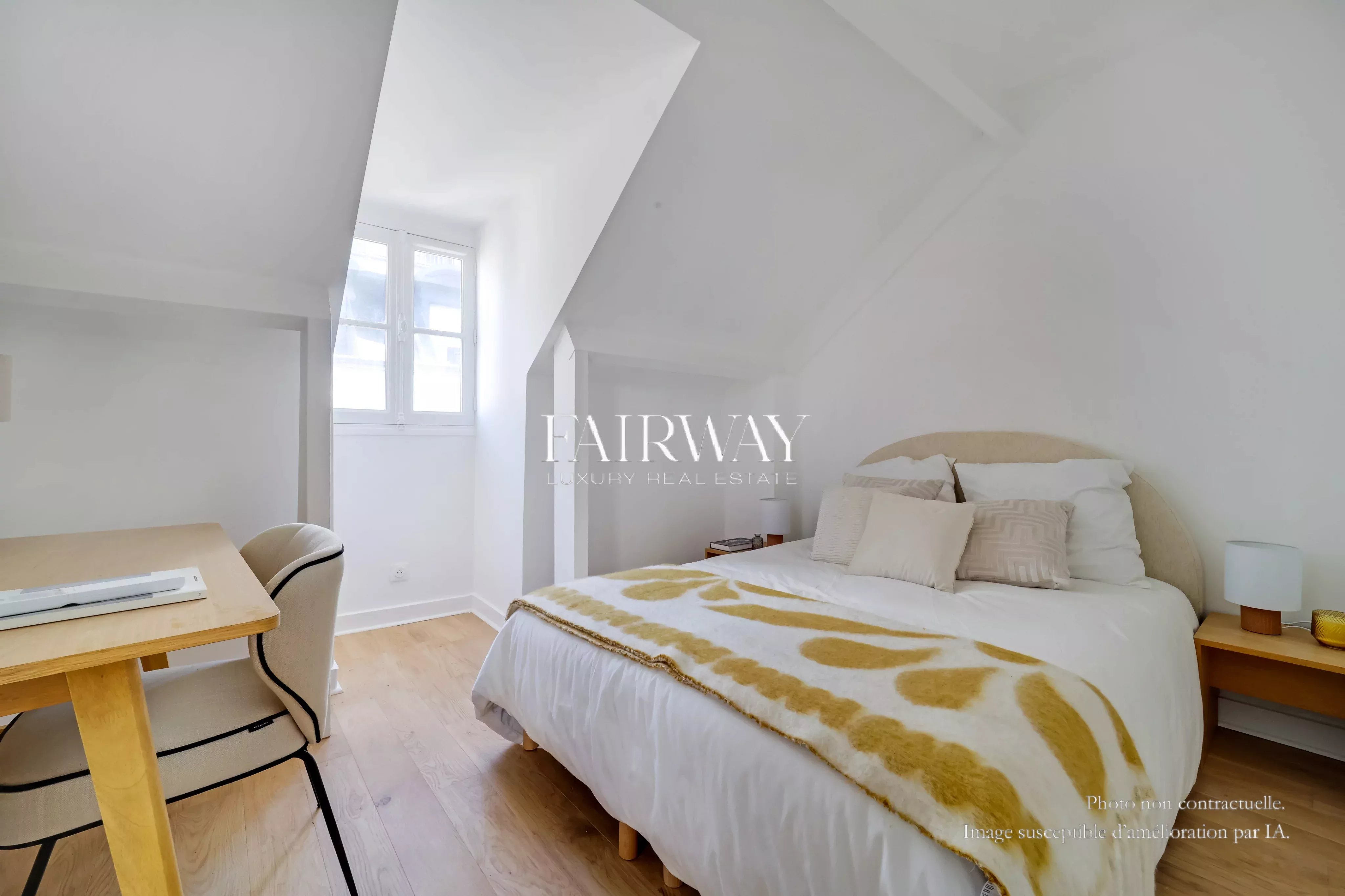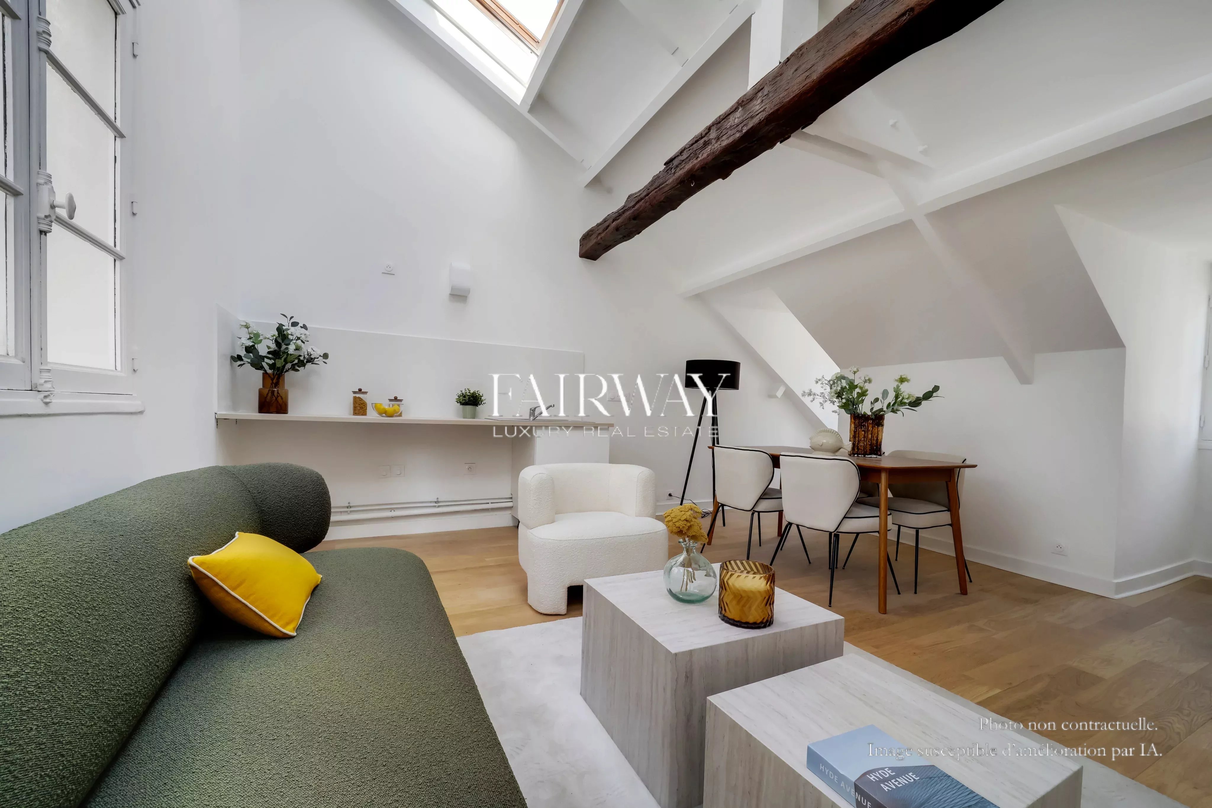 Fairway Luxury Real Estate offers this elegant 2-bedroom duplex, located on the top floor by elevator of a recently renovated building, in the heart of the 4ᵉ arrondissement of Paris.