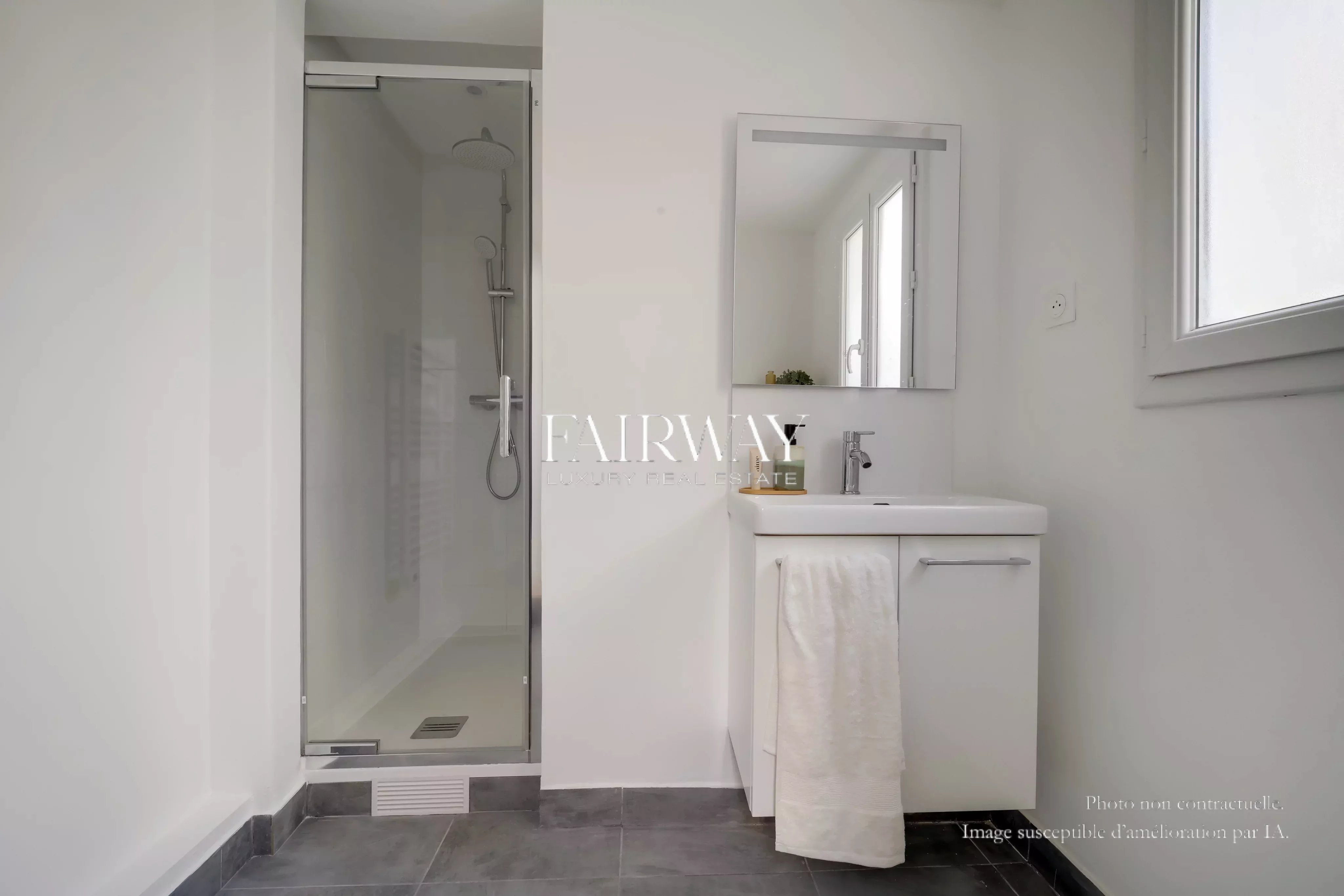 On the upper floor, the apartment reveals a cathedral living room with remarkable volumes, sublimated by a ceiling height of around 4 meters. Natural light floods in generously through the windows and roof openings, creating a bright, peaceful atmosphere. The open kitchen is elegantly integrated into the reception area.
